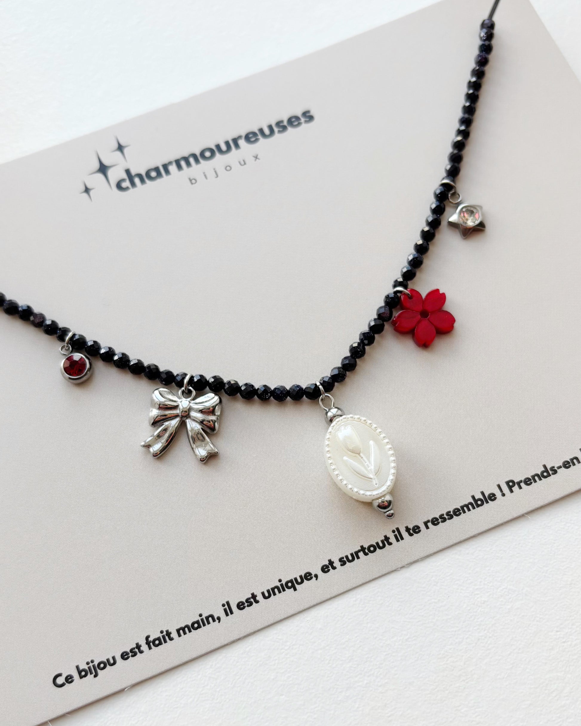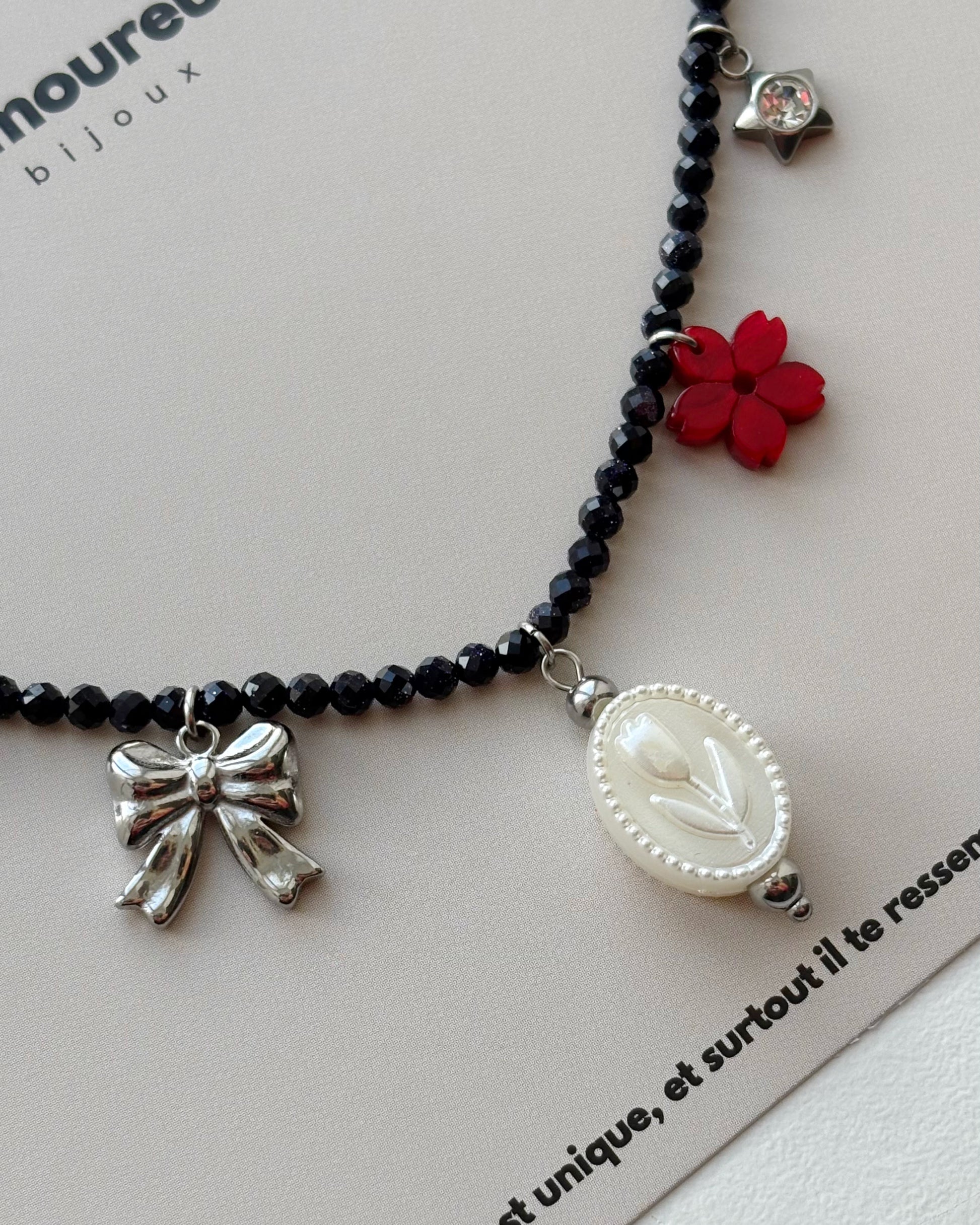 Collier en perles bleu nuit composé de 5 charms, disponible en 1 exemplaire unique.